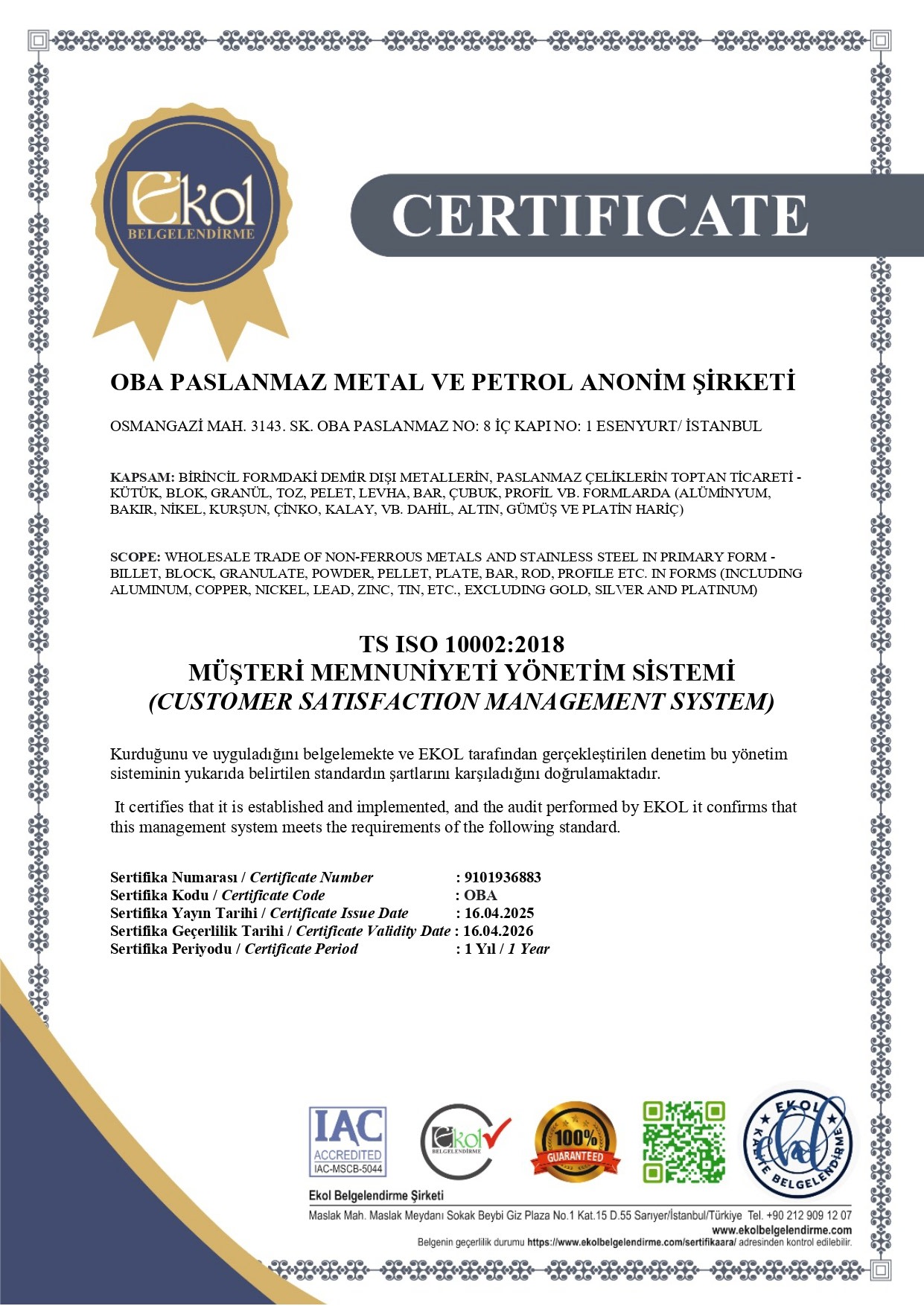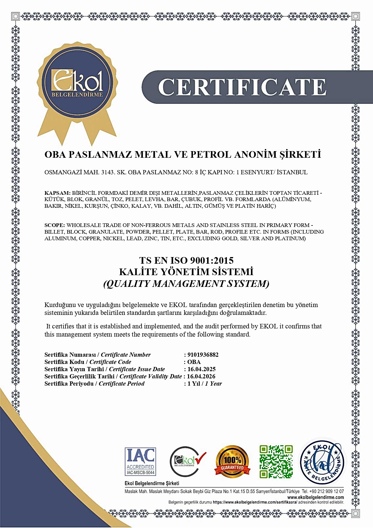 Azerbaycan merkezli Oba Paslanmaz, paslanmaz çelik sektöründe liderdir ve Avrupa ile Uzakdoğu'da sağlam bağlantılara sahiptir. Geniş ürün yelpazesi ve kaliteli insan kaynaklarıyla Türkiye'de hızla tanınmıştır. Müşteri ihtiyaçlarına hızlı ve etkili çözümler sunan firma, sektörde güvenilir bir ortaklığa olanak tanır.